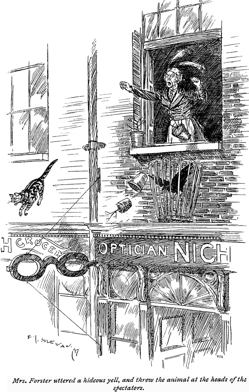 "Mrs. Forster uttered a hideous yell, and threw the animal at the heads of the spectators." From Newton Forster by Frederick Marryat and illustrated by E. J. Sullivan, 1897.