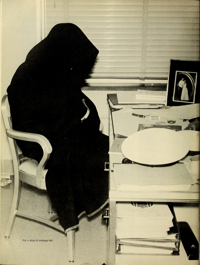 The caption says, "Not a drop of entropy left."  From the United States Naval Academy's 1964 yearbook.