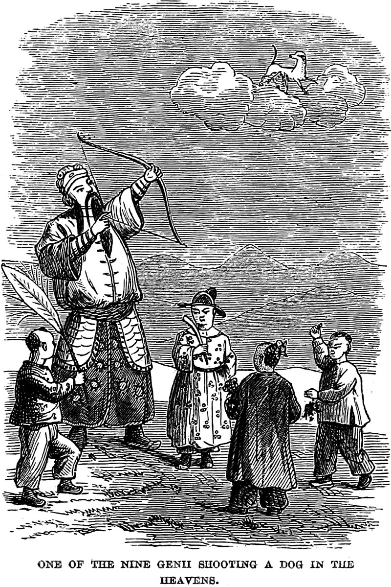 "One of the nine genii shooting a dog in the heavens," from Social Life of the Chinese by Justus Doolittle, 1867.