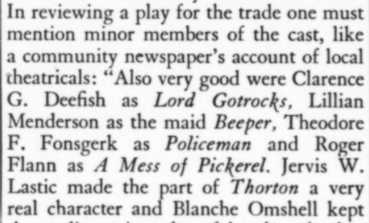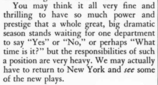 There is always a little difficulty in hearing these all-star revivals, owing to the presence in the audience of demonstrative adherents of the various stars....But when you do catch a line of dialogue...it fits in very nicely with your general idea of what the play is about. [Benchley]