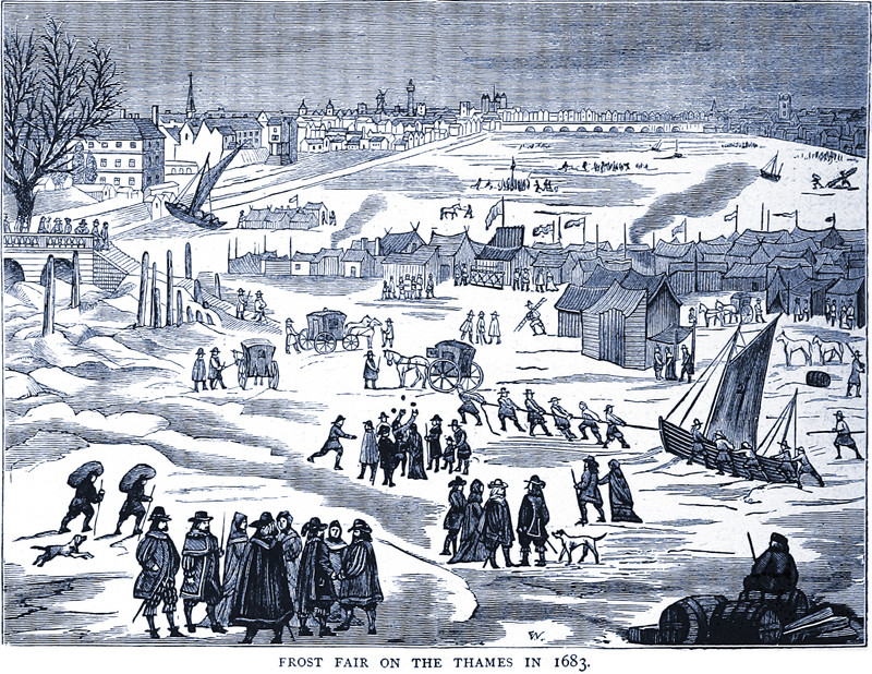 Frost fair on the Thames in 1683, as depicted in Old & New London by George Walter Thornbury, 1897.