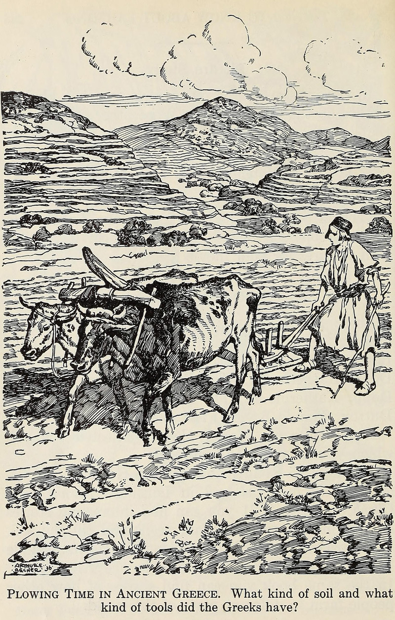 #vintage illustration #greece #greek #1940s #farmer #illustration #plow #ox