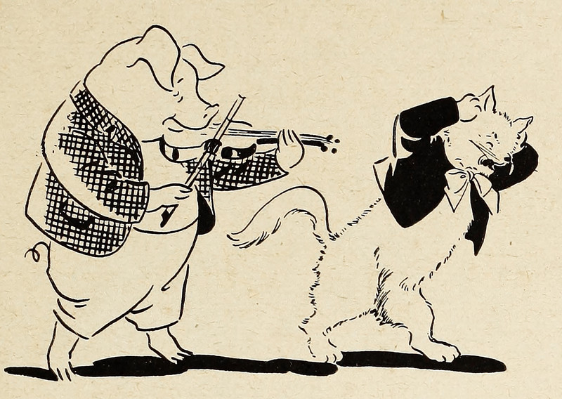 #vintage illustration #anthropomorphism #cat #violin #musical animal #pig #1940s #illustration