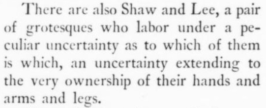 3. Shaw and Lee can be found online; but, unlike Fuzzy Knight, they did not (imho) live up to the promise. Best moment I found was when, in a routine where they trade off delivering oneliners, they both start delivering the same joke at once, in unison (then look at each other in surprise, and simultaneously stop talking).
