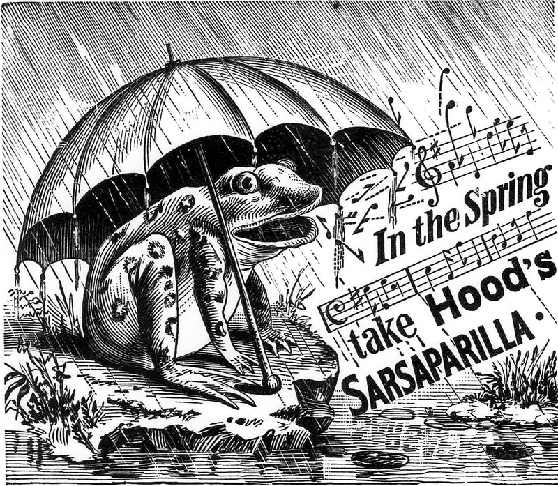 #vintage illustration #vintage ad #rainy day #frog #musical animal #illustration #singing frog #1880s #ad
