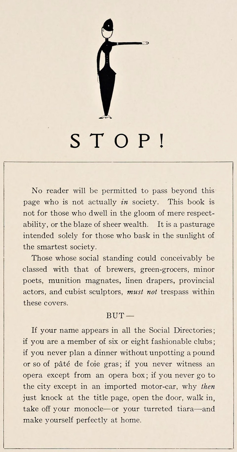 "Just knock at the title page, open the door, walk in, take off your monocle—or your turreted tiara—and make yourself perfectly at home." From High Society: Hints on How to Attain, Relish, and Survive It by Fish, 1915.