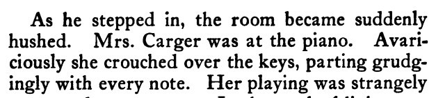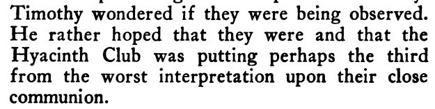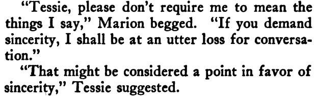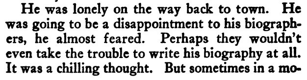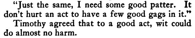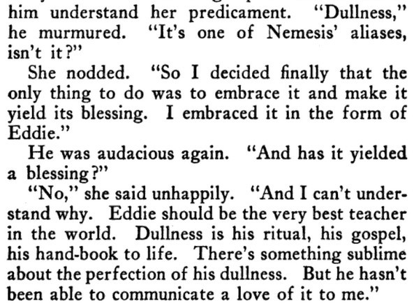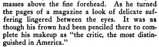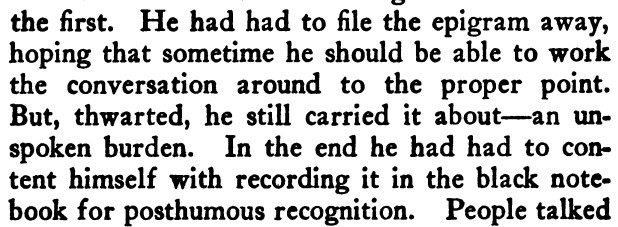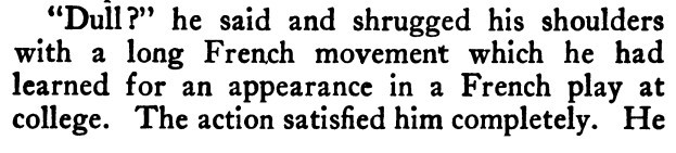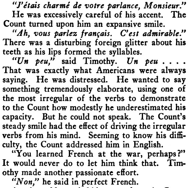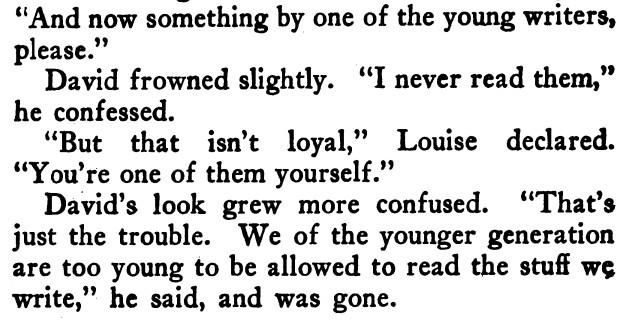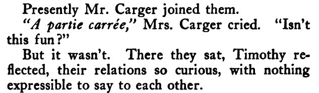 ***Her attitude was paradoxically one of animated inattention.***"I won the Somebody-or-other prize for this or that at art school."***Timothy tightened his smile as though he feared to have it slip from him.***Timothy faced the typewriter with dull resentment. Too obviously the thing had no poetry in its nature.***Almost instinctively he looked about for something to tap with an emphatic forefinger.***the eternal temptation of the dimly perceived***She shrugged her shoulders, catching the movement midway as though to conserve energy.***He covered his sheet with vacuous faces all turned to the left as though toward some Mecca of the amateur portraiteur.***"You see, I'm something or other in disguise, going about doing good deeds."***And turning abruptly she went out of the room and to Europe.***"It's damn funny if you look at it that way."[....]Things which were damned funny if you looked at them that way continued to happen.***