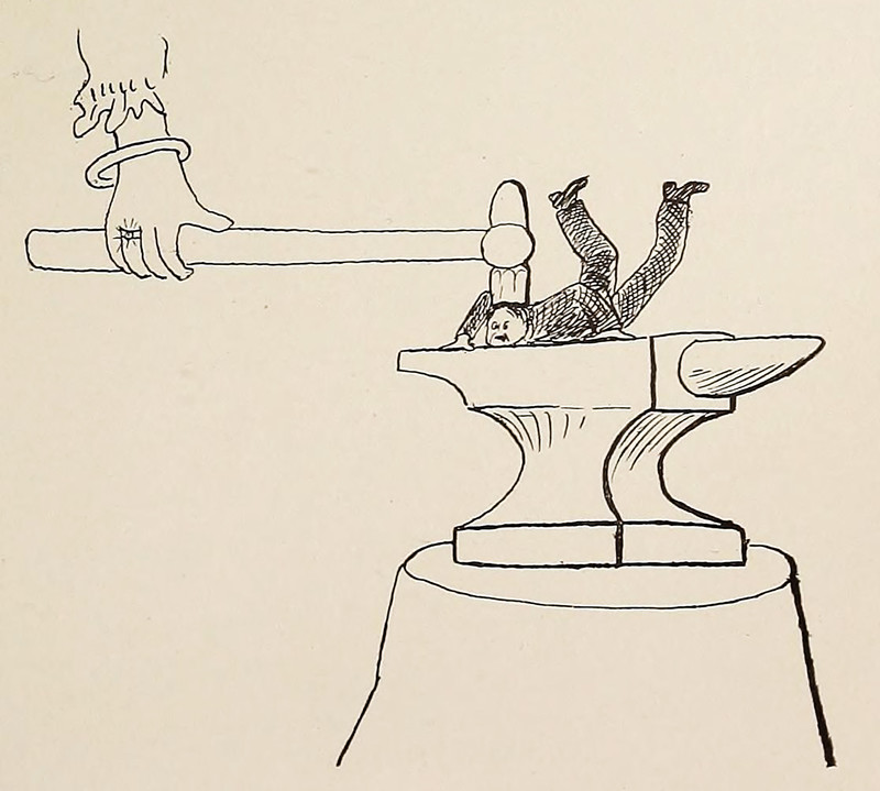 #vintage illustration #vintage yearbook #yearbook #tiny man #crushed #anvil #1900s #illustration