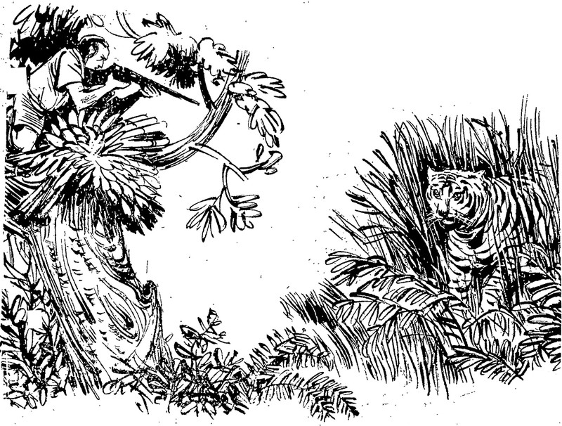 #vintage illustration #tiger #hunter #1960s #illustration #up a tree