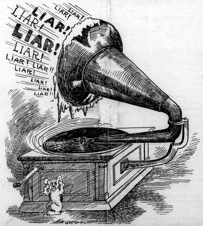 #vintage illustration #political cartoon #dog #liar #phonograph #his master's voice #1900s #illustration