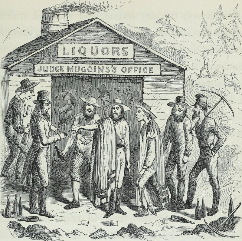 A combination bar and courthouse? From Mountains and Molehills by Frank Marryat, 1855.