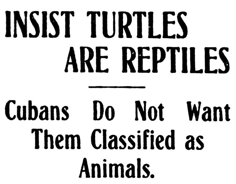 "Insist turtles are reptiles.  Cubans do not want them classified as animals."  From the Duluth Evening Herald, 1908.