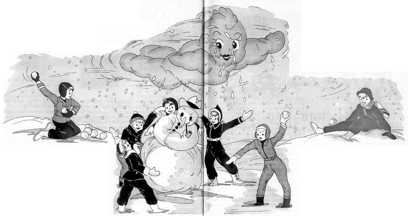 #vintage illustration #snowman #winter #cloud #1940s #illustration