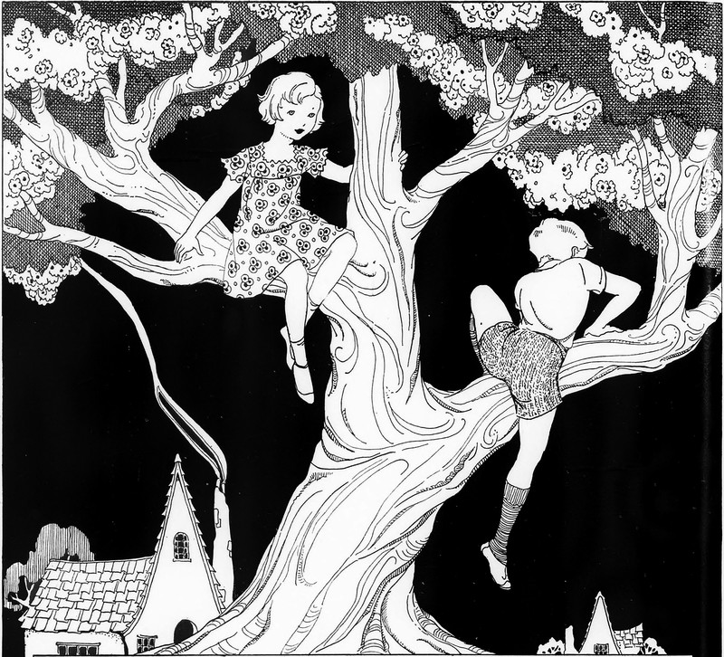 #vintage illustration #1930s #apple tree #illustration #up a tree