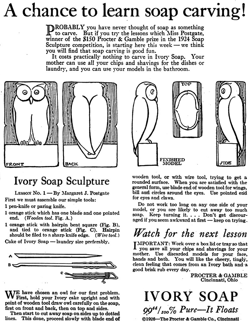 #vintage illustration #vintage ad #owl #1920s #illustration #soap carving #soap #ad