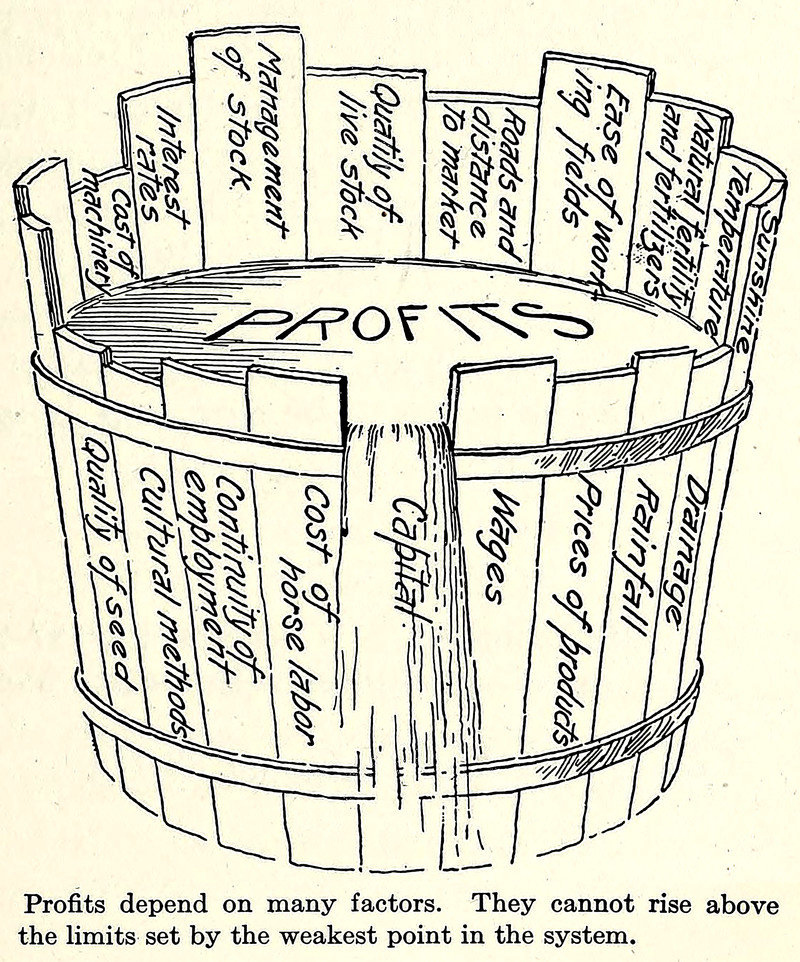 Profits "cannot rise above the limits set by the weakest point in the system."  From Farm Management by George Warren, 1920.