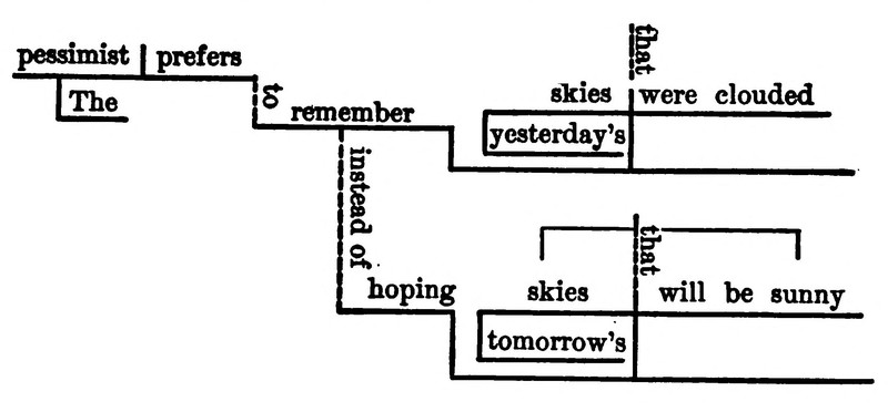 "The pessimist, instead of hoping that tomorrow's skies will be sunny, prefers to remember that yesterday's skies were clouded." From Manual and Diagrams to Accompany Metcalf's Grammars by Carl Garrison, 1901.