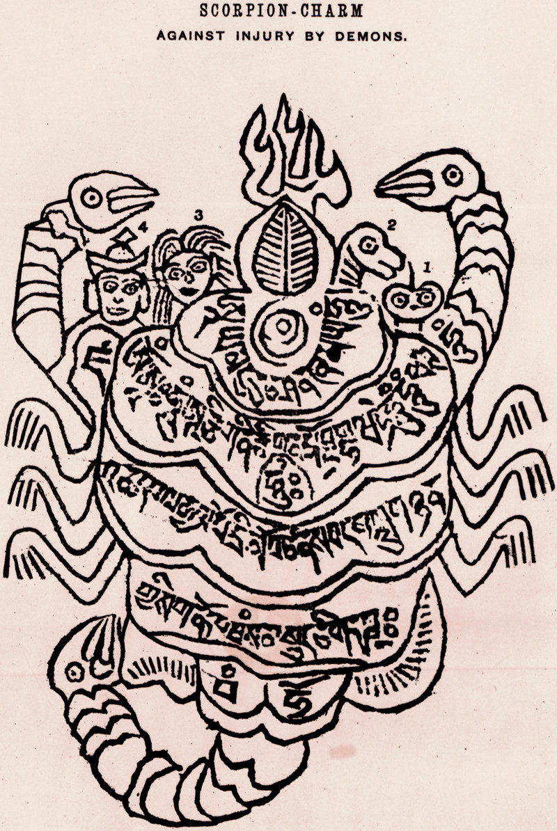 Here's a "scorpion-charm against injury by demons," from The Gazetteer of Sikhim, 1894.