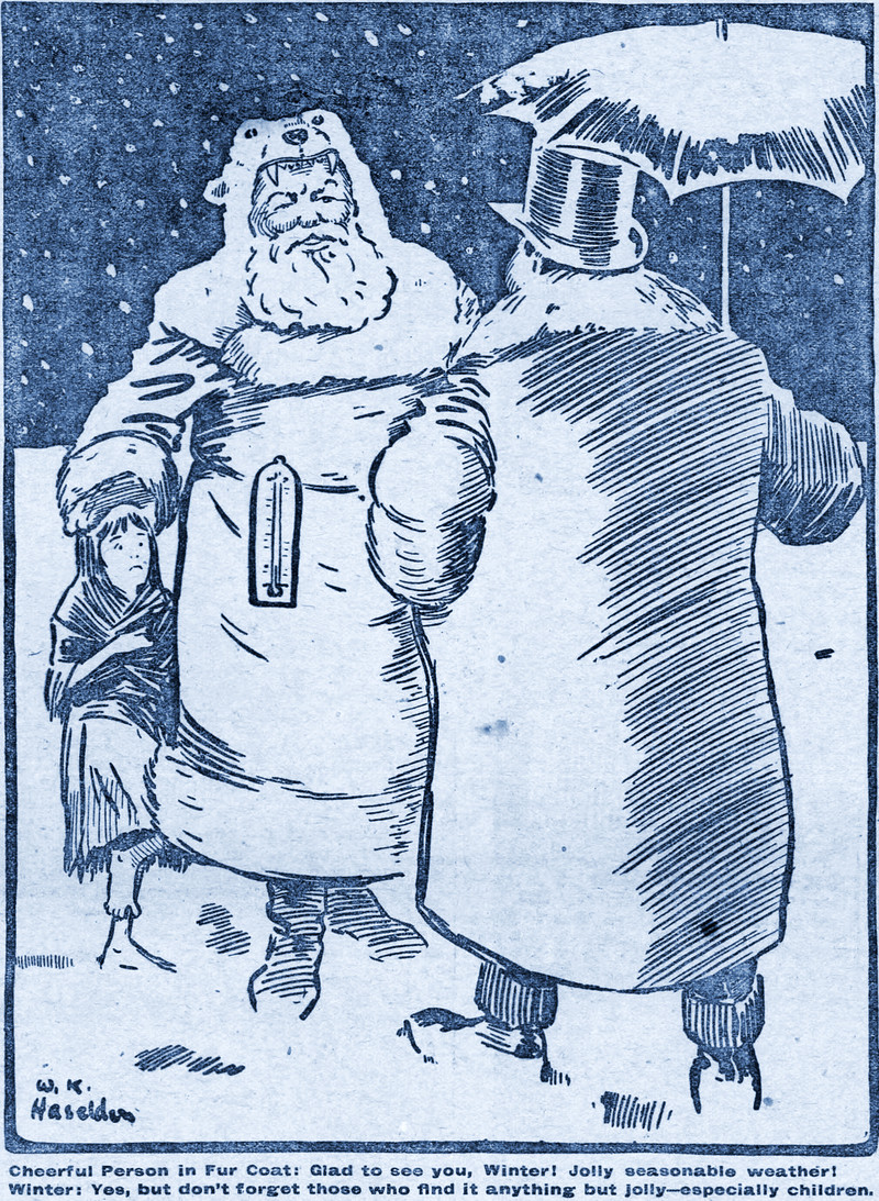 Old Man Winter takes no responsibility for the warmth of waifs, strays, or urchins.  From The Daily Mirror1904.