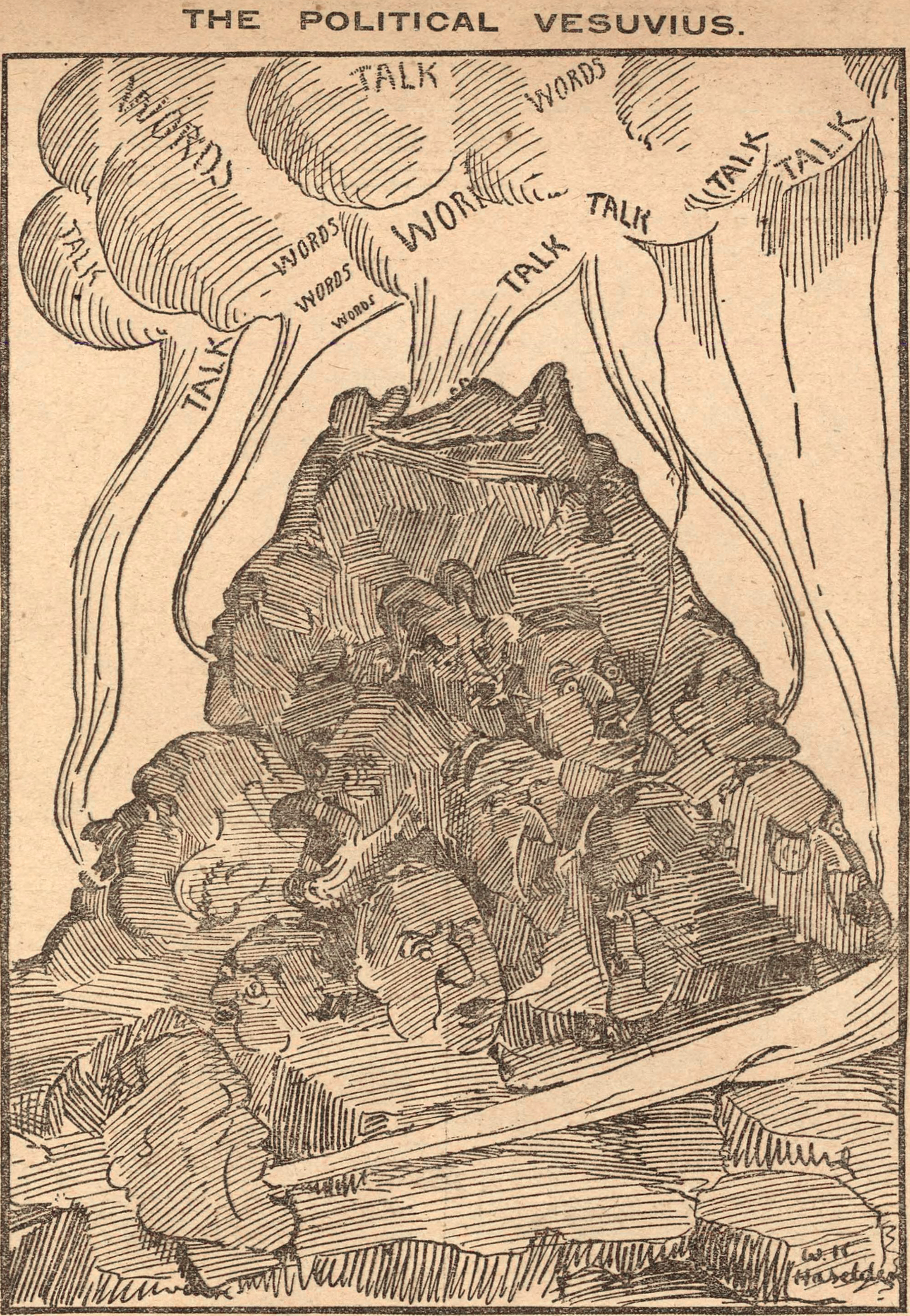 Four decades before the presidential faces carved into Mt. Rushmore, there was this volcano of political blather.  From the Daily Mirror, 1904.