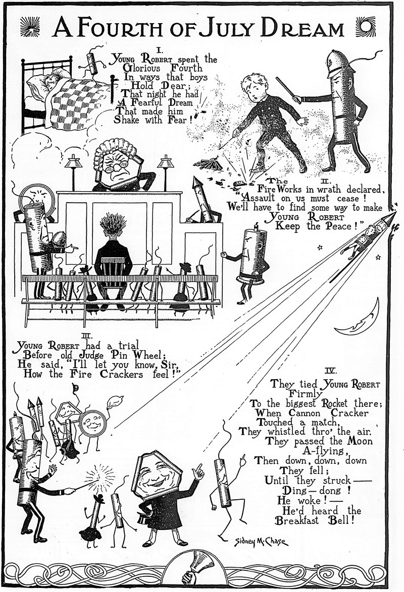 #vintage illustration #nightmare #anthropomorphism #fourth of july #fireworks #1900s #tables turned #illustration
