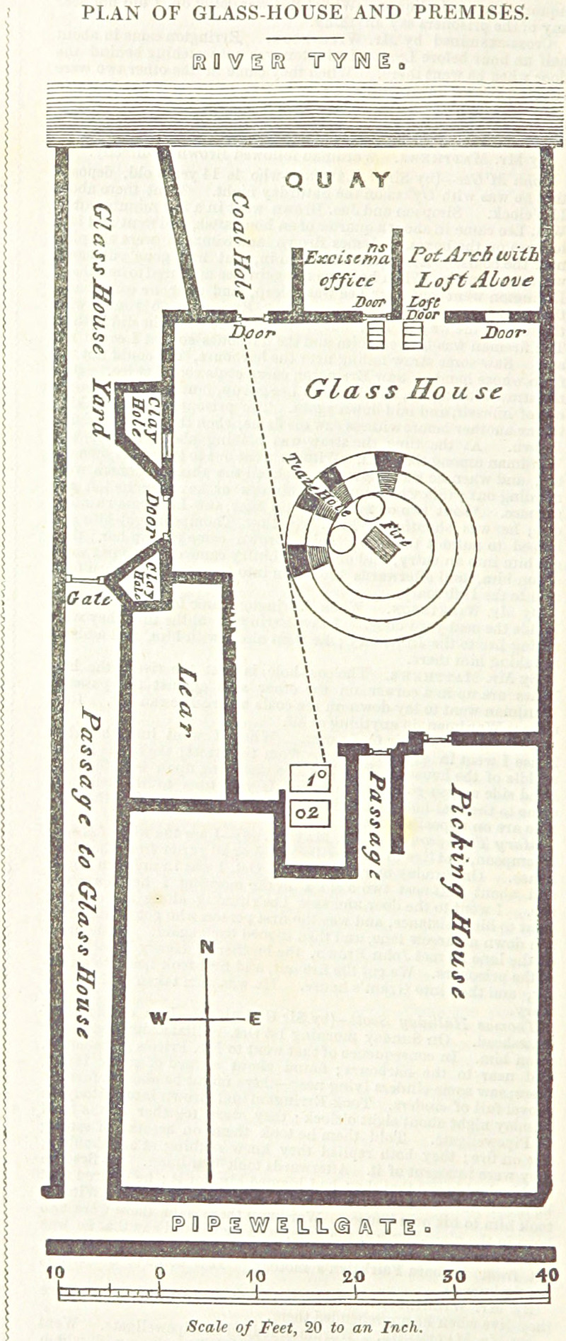 You've heard it said that people who live in glass houses shouldn't throw stones, but—as we see in this plan of the original Glass House, they can safely throw lumps of coal.  (Note the "Coal Hole" door facing the river.)  From Local Collections; or Records of Remarkable Events Connected with the Borough of Gateshead, 1837-1839.
