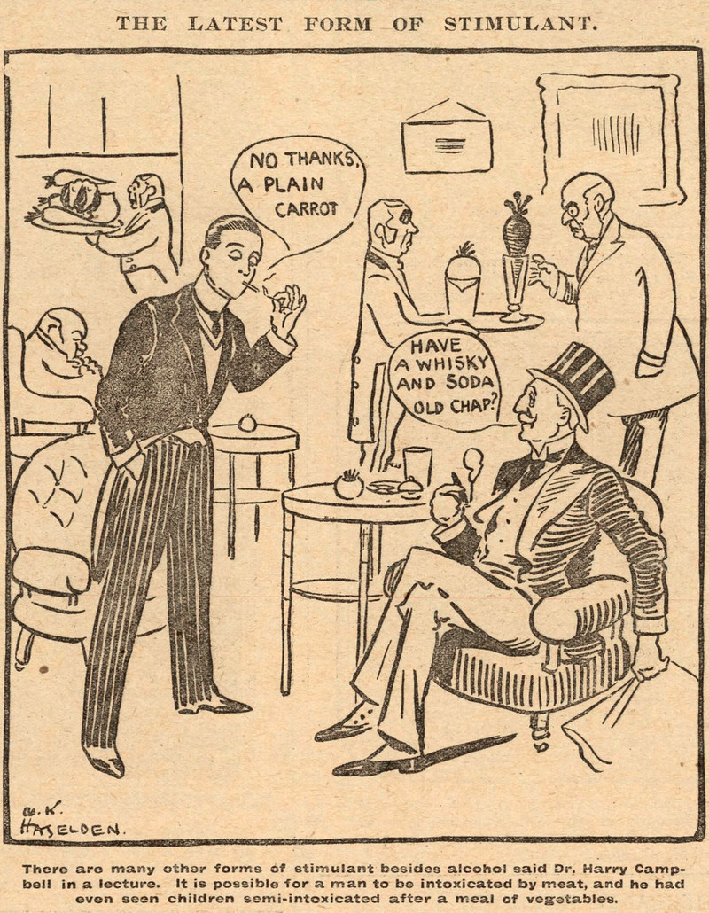 Here's why vegetarians are always semi-intoxicated.  From the Daily Mirror, 1906.