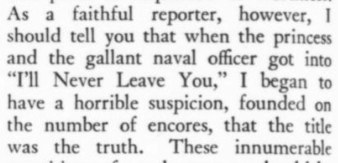 The head of the spectator in front of me grows to the size of a Hallowe'en pumpkin the moment anything interesting occurs in the center of the stage.