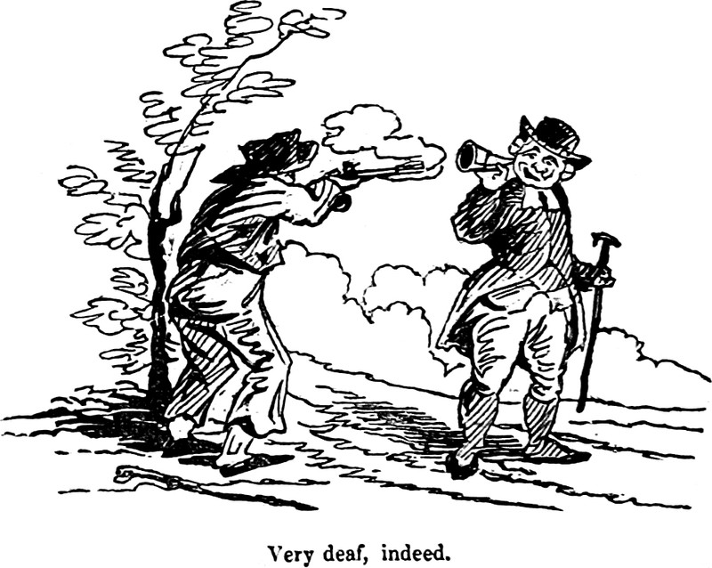We presume that gun is a "repeater."  From Whims and Oddities in Prose and Verse by Thomas Hood, 1829.  The caption reads, "Very deaf, indeed."