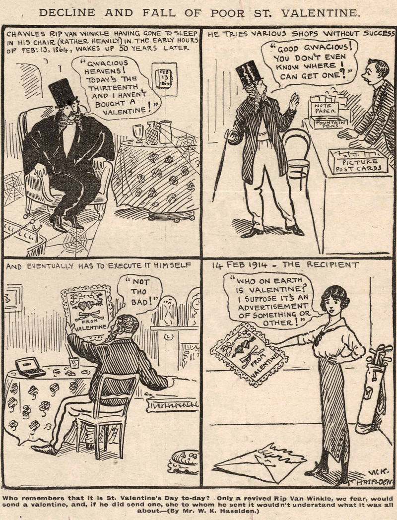 Nobody was sending Valentine cards in the 1910s.  From the Daily Mirror, 1914.
