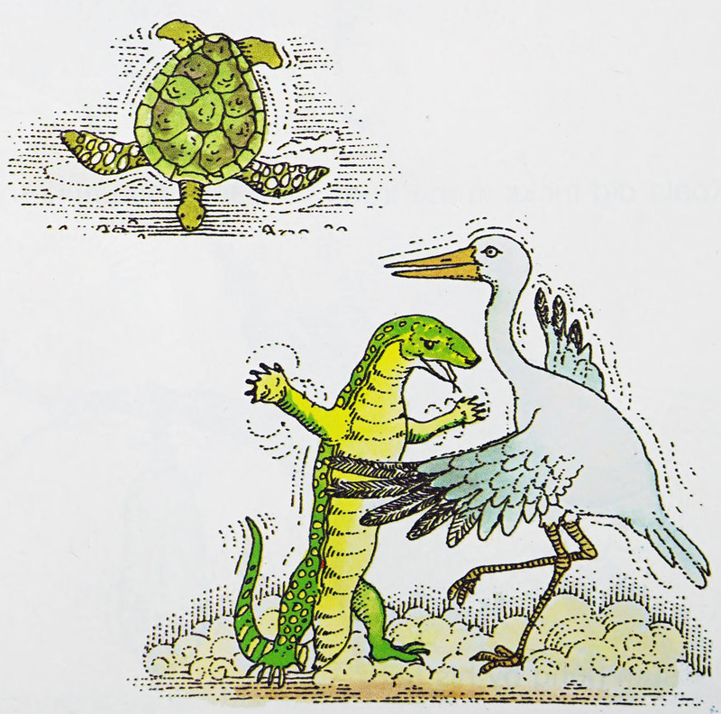 #vintage illustration #anthropomorphism #bird #turtle #lizard #1970s #illustration #dancing animals #goanna #brolga