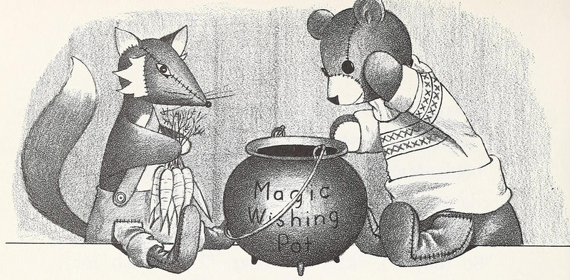#vintage illustration #cauldron #teddy bear #1960s #illustration #living toy #fox toy