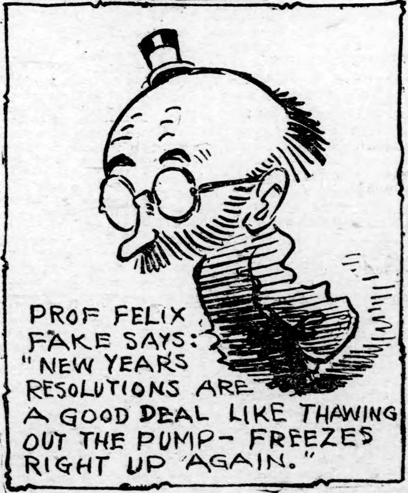 "Prof. Felix Fake says: 'New year's resolutions are a good deal like thawing out the pump — freezes right up again." From the Duluth Evening Herald, 1915.