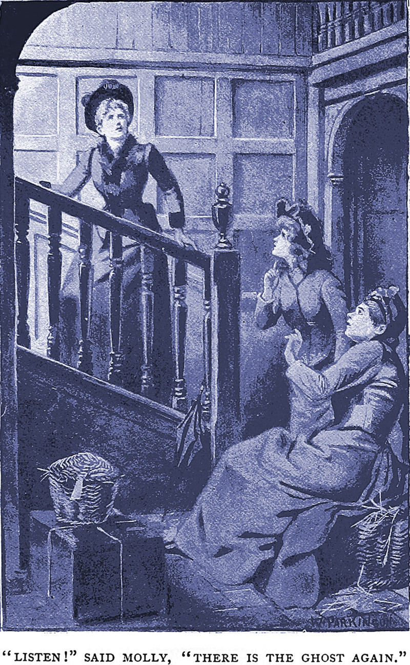 "'Listen!' said Molly, 'there is the ghost again."  From Three Bright Girls by Annie E. Armstrong, 1892.