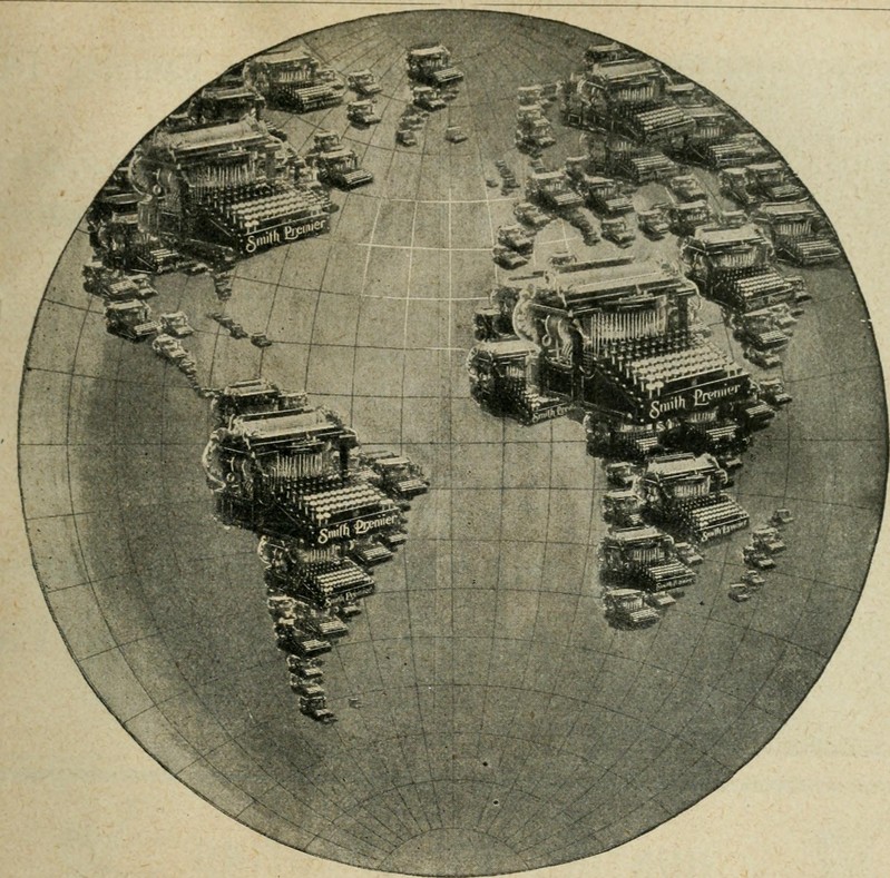 Which came first, the world of typewriter art or the, um, art of the typewriter world? Our illustration of the typewriter world appears as an ad in Rod and Gun, 1891.