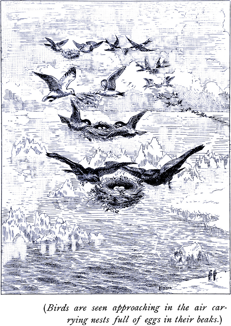 "Birds are seen approaching in the air carrying nests full of eggs in their beaks." From The Paradise of Birds by William John Courthope and illustrated by Lancelot Speed, 1889.