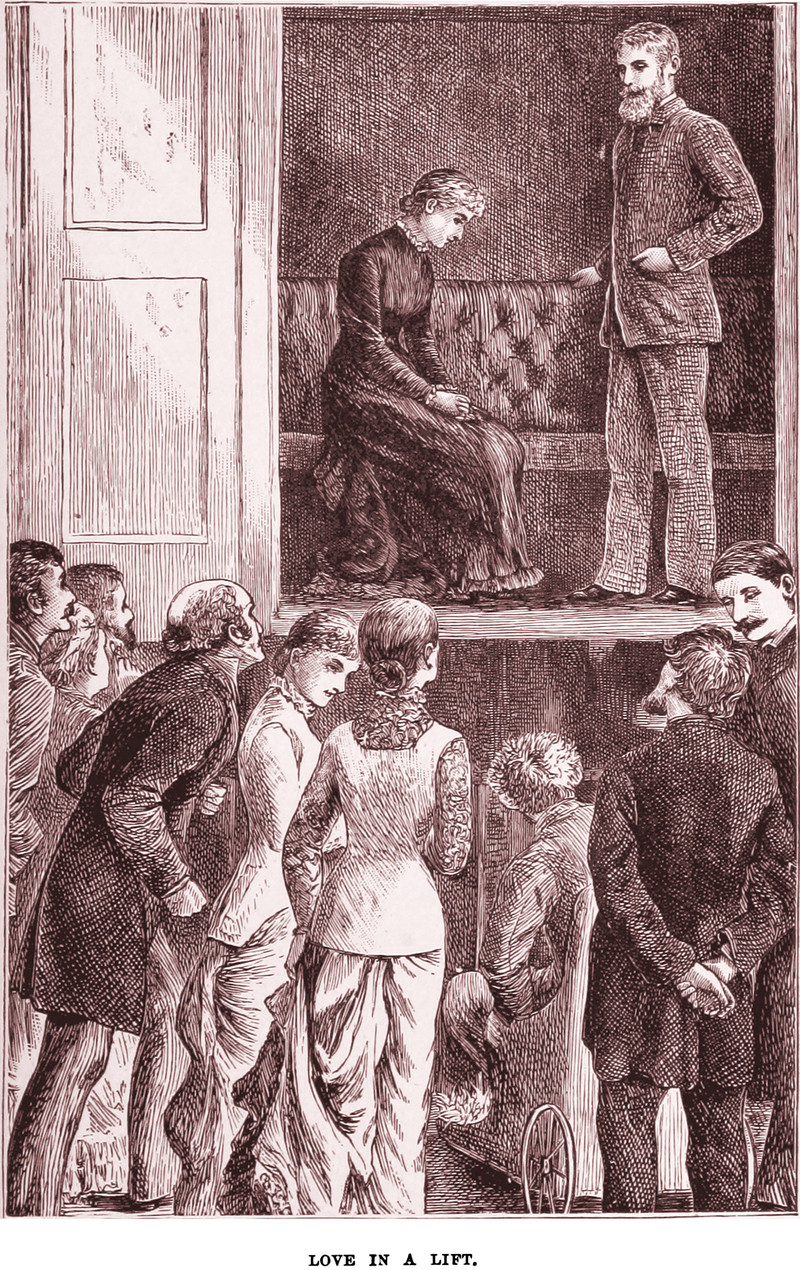 Here's a precursor to the Aerosmith song "Love in an Elevator," from The Dove's Nest and Other Tales, 1886.  The caption reads, "Love in a lift."