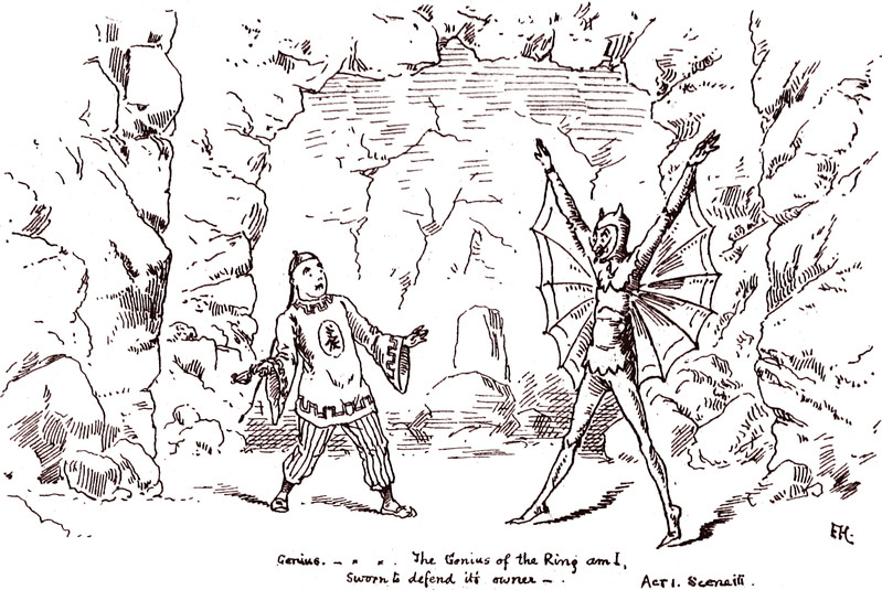 "The Genius of the Ring am I, sworn to defend its owner." From Aladdin, or, the Wonderful Scamp! An Original Burlesque Extravaganza in One Act by Henry James Byron, 1882.