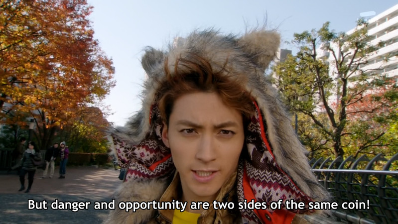 "But danger and opportunity are two sides of the same coin!"  From Kamen Rider Wizard.