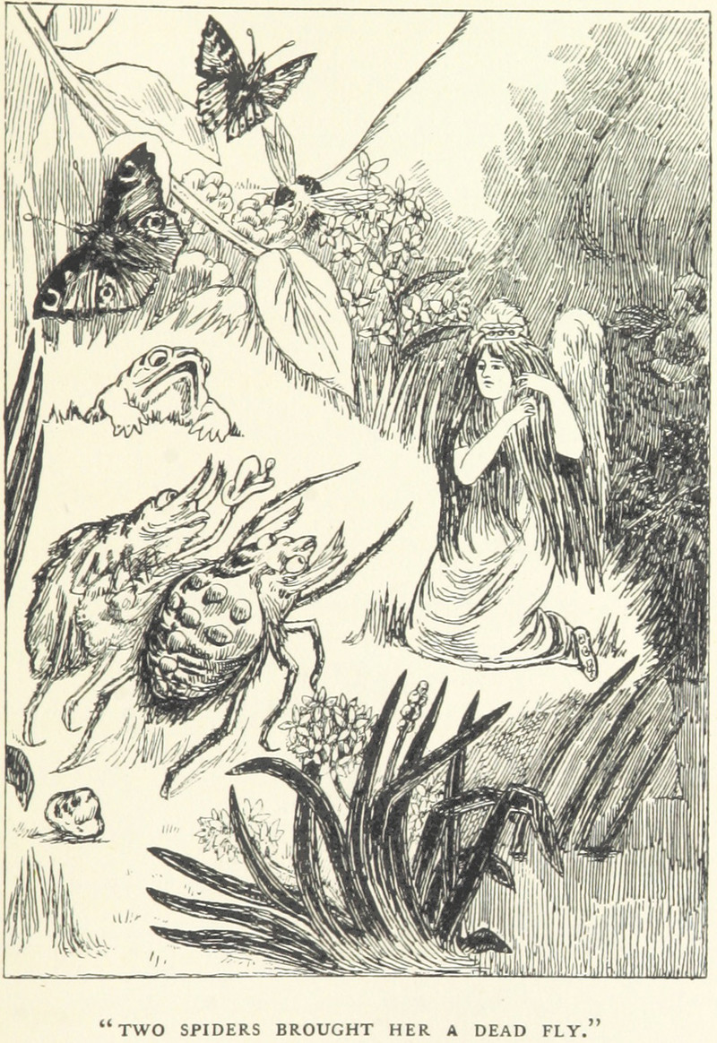 From The Revelations of a Sprite, written and illustrated by Auber Melville Jackson, 1897.  The caption reads: "Two spiders brought her a dead fly."