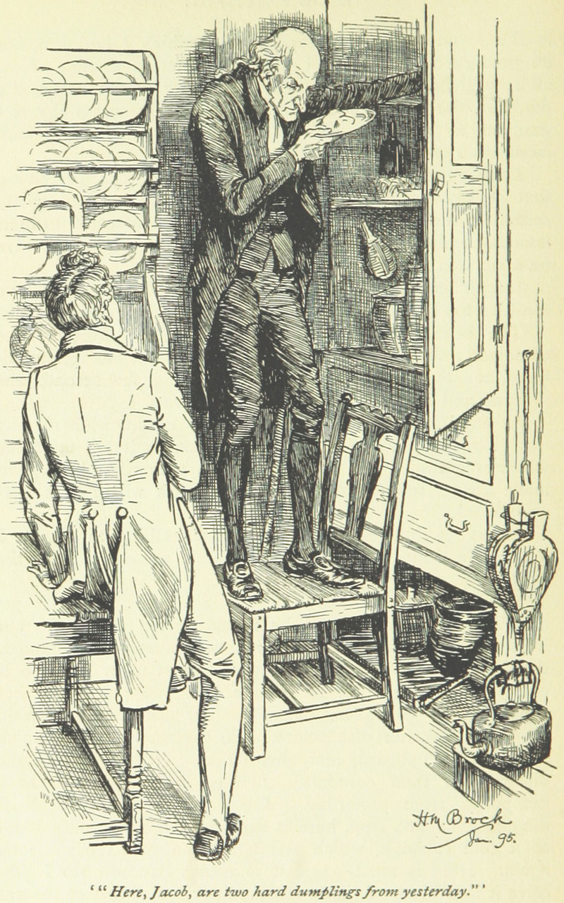 "Here, Jacob, are two hard dumpings from yesterday," from Jacob Faithful by Frederick Marryat and illustrated by H. M. Brock, 1895.