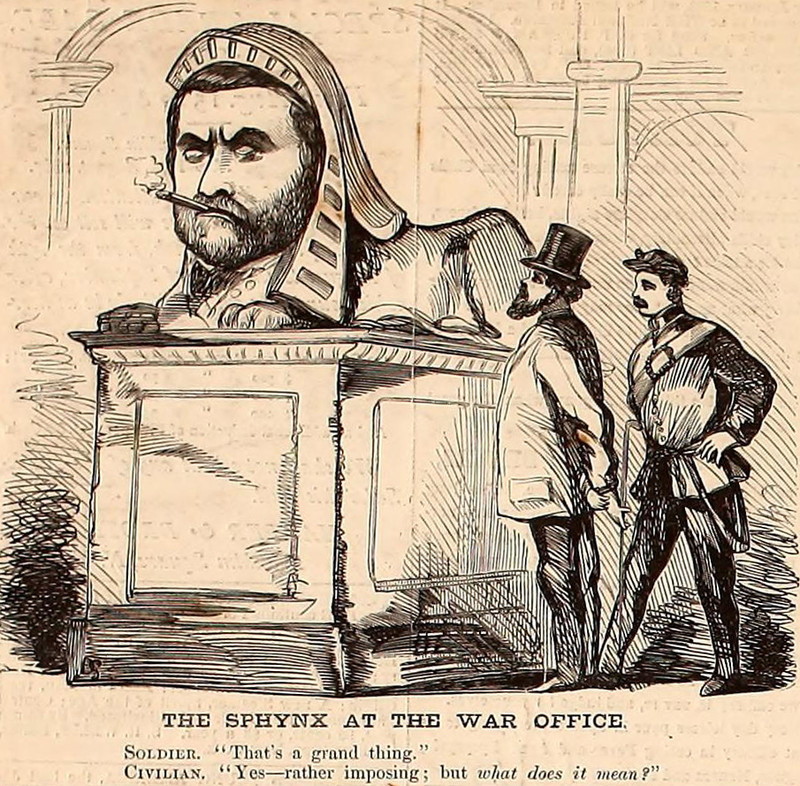 "The Sphynx at the war office.  Soldier: 'That's a grand thing.'  Civilian: 'Yes—rather imposing; but what does it mean?'"  From Harper's Weekly, 1867.
