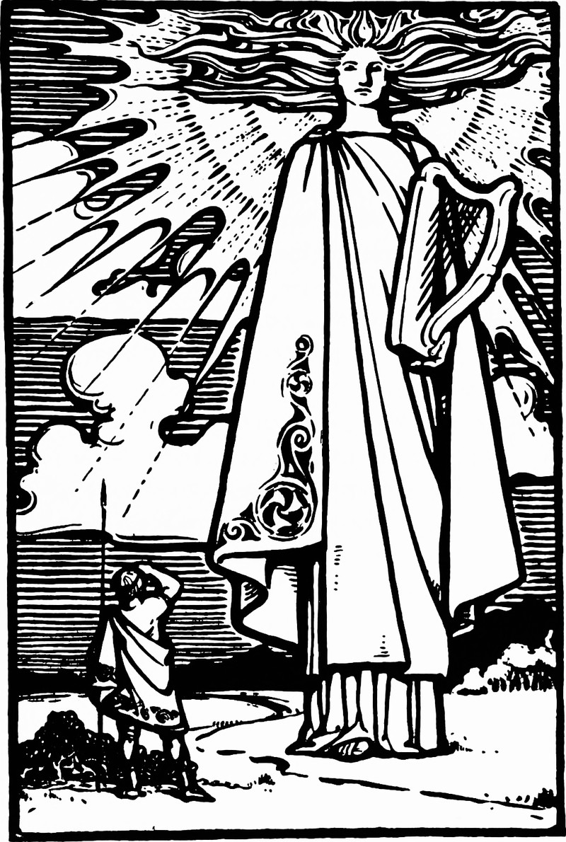#vintage illustration #mythology #giant #solar deity #harp #rising sun #sun god #illustration