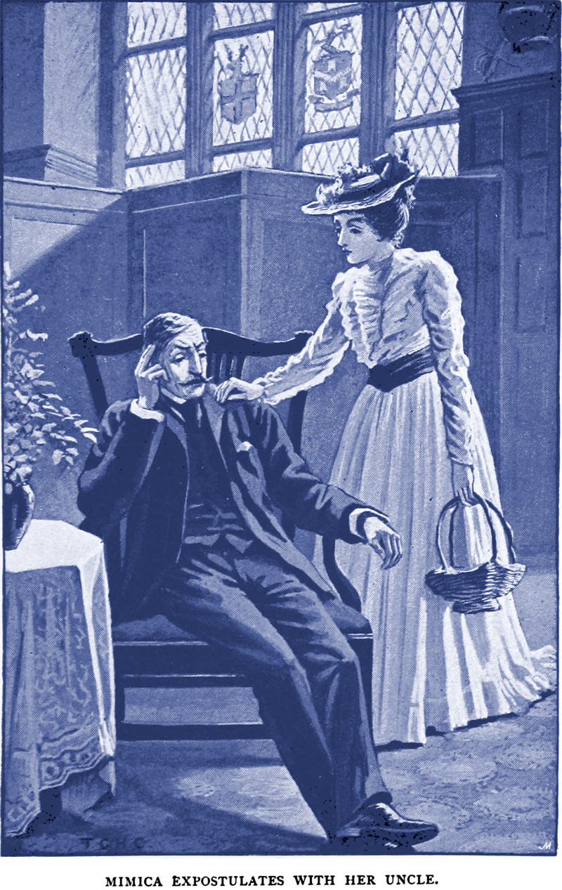 "Mimica expostulates with her uncle," though mostly repeats what he says, surely.  From Courtleroy by Ann Neale, 1893.