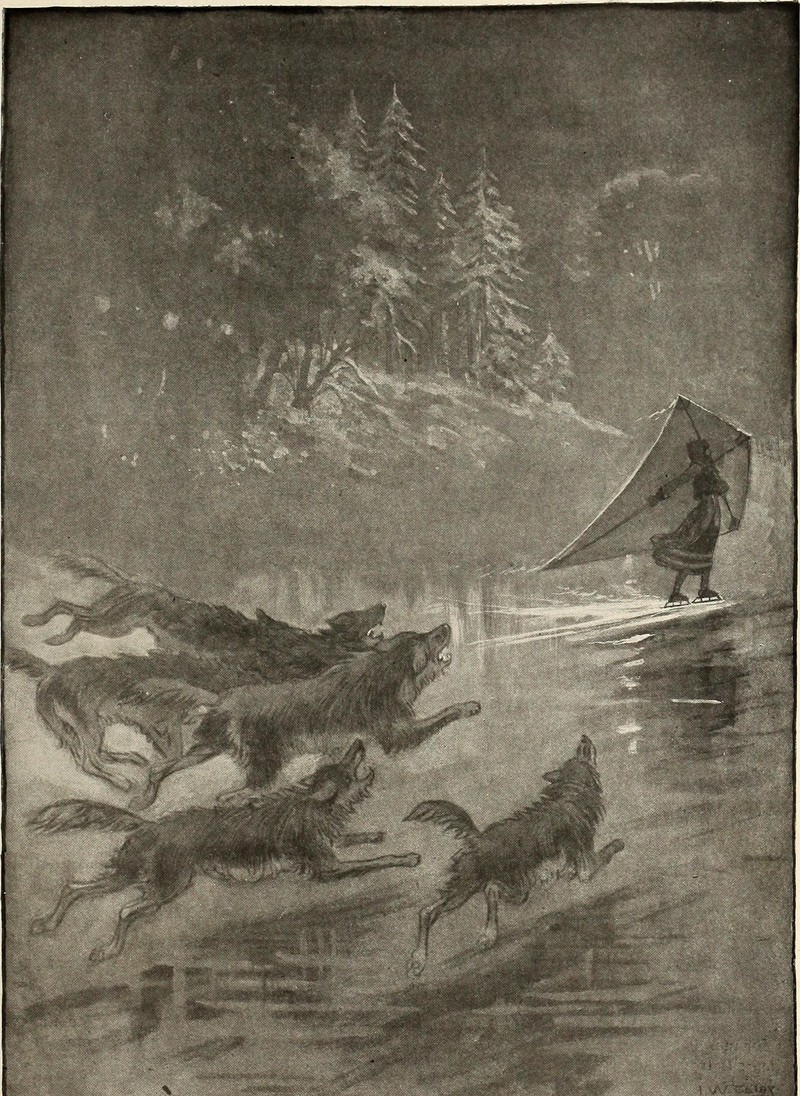 When you're being chased by wolves down a frozen river, have skates and a kite handy and see for yourself what a difference they make. From St. Nicholas magazine, 1910.