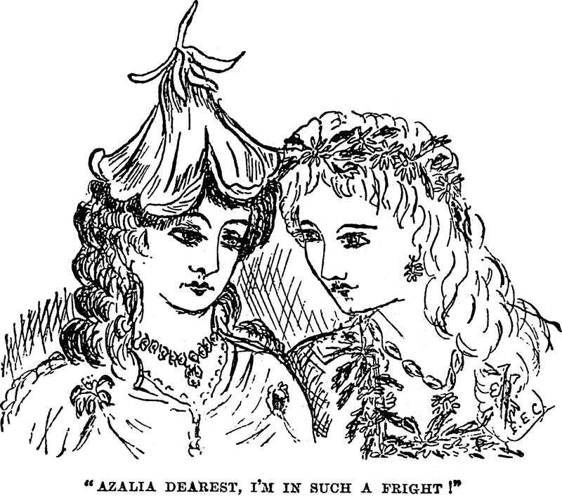 "Azalia dearest, I'm in such a fright!" From Home-Theatricals Made Easy, or, Busy, Happy, and Merry by Frances Elizabeth Callow, 1891.