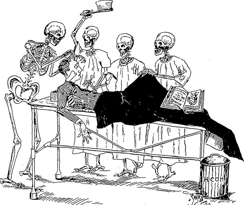 #vintage illustration #macabre #death #skeleton #doctor #vintage yearbook #yearbook #operation #illustration #art