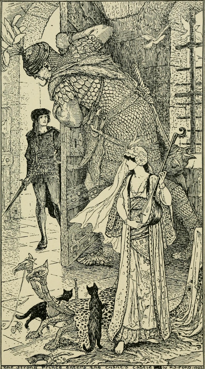 "The strong prince enters the giant's castle."  From The Crimson Fairy Book by Andrew Lang, 1903.