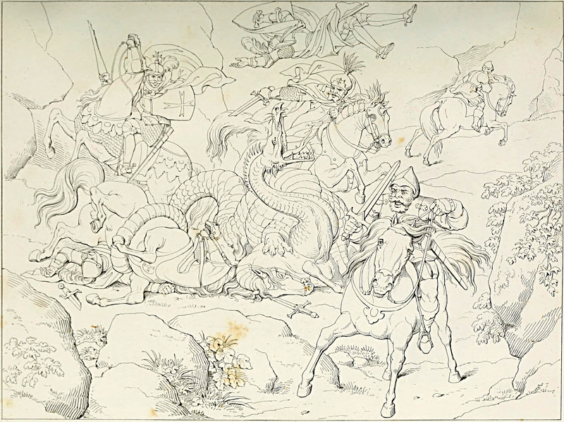 From The Fight with the Dragon by Friedrich Schiller and illustrated by Henry Moses from the designs of Retsch, 1825.