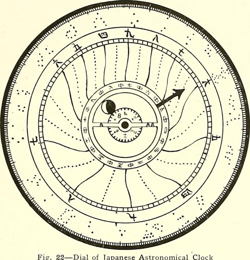 The dial of a Japanese astronomical clock, from Time and Its Measurement by James Arthur, 1909.